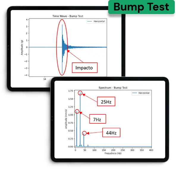 Identificamos as frequências naturais de vibração de uma máquina ou estrutura. Este teste é essencial para diagnosticar e prevenir problemas de ressonância, uma das principais causas de falhas em equipamentos.